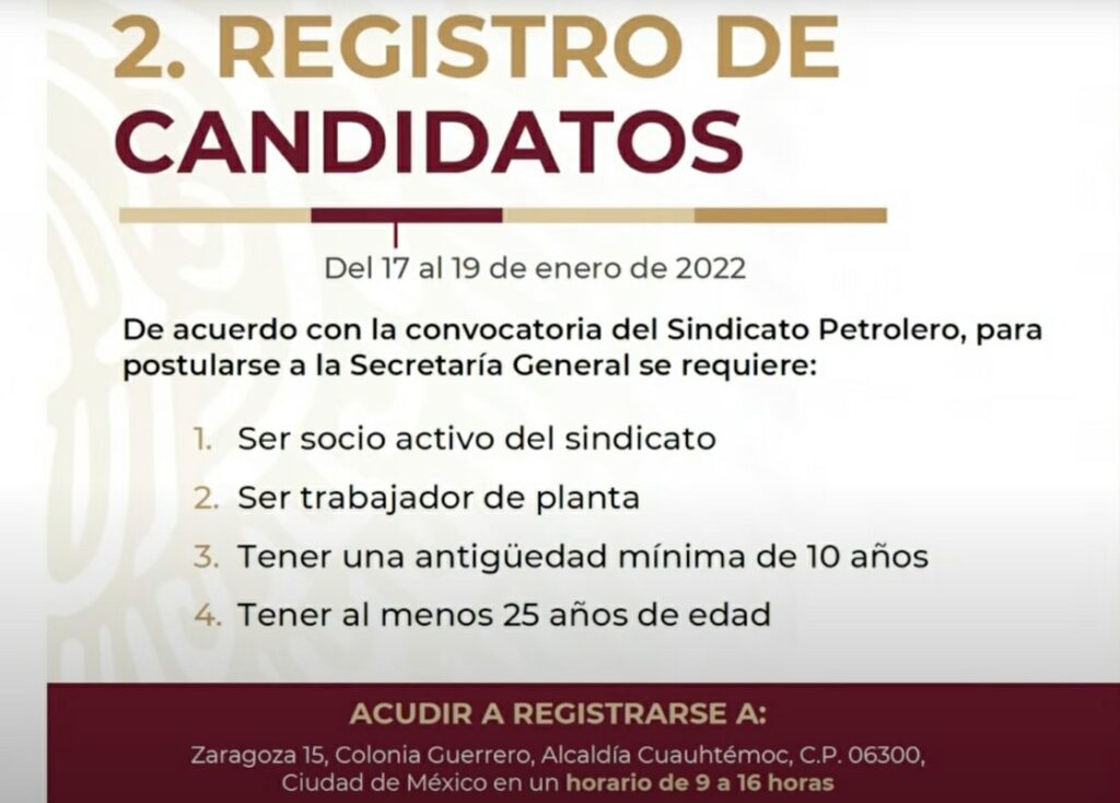 De acuerdo con la convocatoria emitida por el sindicato petrolero, los candidatos que aspiren a dirigir el STPRM deberán cumplir con cuatro requisitos: ser socio activo del sindicato; ser trabajador de planta; tener una antigüedad mínima de 10 años; y tener al menos 25 años de edad.